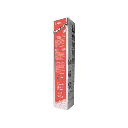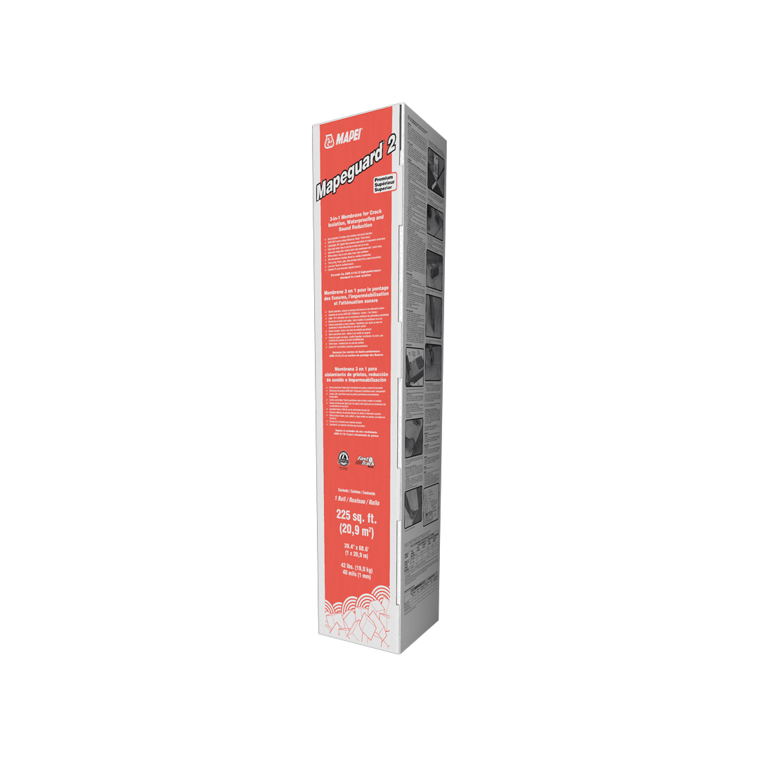 Mapeguard 2 is a next-generation, flexible, thin, 40-mil (1-mm) lightweight, load-bearing, fabric-reinforced “peel-and-stick” crack-isolation, waterproofing and vapor-control membrane. Mapeguard 2 helps to prevent existing or future in-plane floor cracks (with movement up to 3/8" [10 mm] wide) from transmitting through grout, ceramic tile and natural stone. It also reduces the transmission of impact sound (footsteps, dropped objects, etc.) and airborne sound (voice, TV, etc.) through floors when installed under ceramic tile, stone or wood floor coverings.
