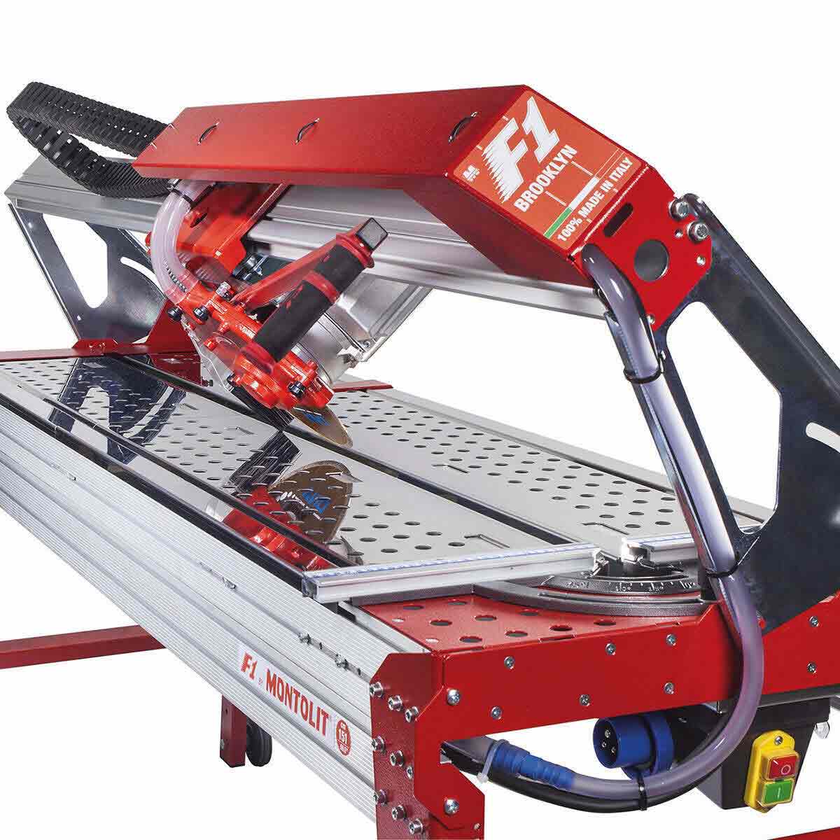 Montolit F1 Brooklyn 40" Tile SawThe Montolit F1 Brookyln Tile saw is designed with a powerful engine, direct transmission and a light but resistant corrosion proof aluminum frame. All the metal parts of this bridge wet tile saw are zinc-plated beforehand and then painted. In order to provide the best match for professional tilers, all Montolit F1 Brooklyn wet table saws include a DNA Diamond blade, which is one of the best blades on the market to accurately cut ceramics and gres porcelain tiles and slabs. Features