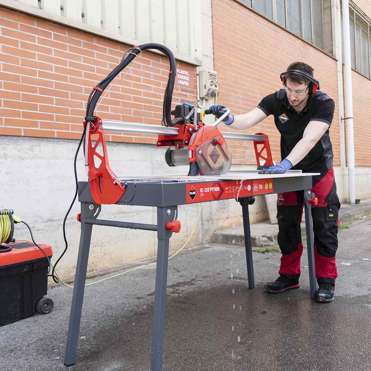 Rubi Tools DC-250 Python Professional Rail SawThe DC-250 Python is a professional saw designed for cutting porcelain, stoneware and ceramic tile. Featuring a movable head for wet cutting with a mitering effect and 1.5 HP engine. C3 Python Cooling SystemThe new system guarantees that water use is optimized by directing it only at the point of contact with the tile. At the same time, it minimizes water loss from the centrifugal effect of the disc, thus reducing splashing. It Guarantees the perfect cooling of the diamond part, prolonging disc life and improving cutting precision. A cooling system with triple contact point between the disc, the water and the material to be cut. The water jet is always tangent to the disc's rotation (not lateral); The tube movement is always concentric to the rotation of the disc, ensuring permanent contact between the nozzle and ceramic, regardless of disc thickness. Utilizing a clip system on the cutting head to quickly and precisely adjust the tube height, thus avoiding direct manipulation and guaranteeing the user's safety when attempting to adjust the cooling jet manually. By providing a height adjustment, it is always possible to guarantee perfect visibility when making the initial cut. Features